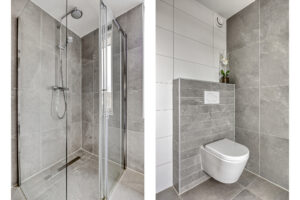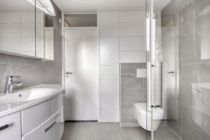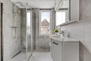 - Moderne en hoogwaardig afgewerkte badkamer met vloerverwarming, inloopdouche, wandcloset, handdoekradiator, wastafelmeubel en spiegelkast