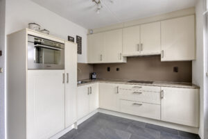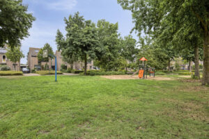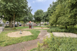 Entree/hal met toegang tot de woonkamer en de vaste kast met meterkast en unit stadsverwarming. De royale L- woonkamer is ca. 35 m² groot, heeft veel lichtinval en biedt mooi uitzicht over de tuin en het speelveld aan de voorzijde. De open keuken is gelegen aan de achterzijde en is voorzien van een keukeninrichting in hoekopstelling met diverse boven- en onderkasten. Aan inbouwapparatuur is aanwezig een inductie kookplaat, afzuigkap, combi oven en koelkast. Er is ruimte voor een vaatwasmachine. Vanuit de keuken is er toegang tot de tuin en de veranda. Vanuit de woonkamer is de tussenhal bereikbaar, hier bevindt zich de toiletruimte met fonteintje en de trapopgang naar de 1e verdieping.Ruime en zonnige tuin met achterom, grote veranda van ca. 20m² en de vrijstaande garage. De garage is voorzien van elektra.