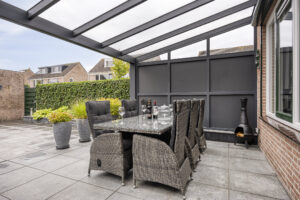 De achtertuin is ca. 10m diep en is gelegen op het zuidoosten. De tuin is fraai ingericht met een veranda, grote terrastegels, borders met vast groen en degelijke erfafscheiding. Verder heeft de tuin buitenverlichting, een buitenkraan, een overkapping voor afvalcontainers en een drainagesysteem voor soepele afwatering. De fraaie aluminium veranda (Pallazzo) is uitgevoerd met verlichting en heeft de mogelijkheid voor het plaatsen van harmonicadeuren. Middels een poort is er toegang tot de straatzijde. De voortuin is eveneens verzorgd ingericht met vast groen en is omheind met een laag stalen hekwerk.