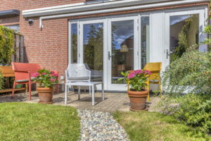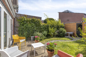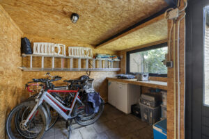 - Vernieuwde, volledig geïsoleerde berging over de gehele breedte van de tuin met elektra en achterom.