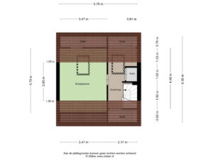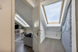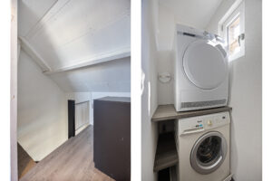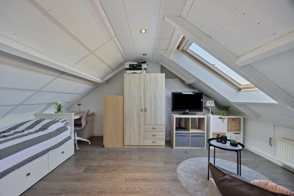 Voorzolder met diverse bergruimte achter de schuine kanten. Verder is deze ruimte voorzien van een Velux dakraam en dient het als opstelplaats voor de CV-combiketel. Tevens treft men hier de aansluitingen ten behoeve van de wasapparatuur (tweede).- Slaapkamer 3, ruime zolderkamer voorzien van een groot Velux dakraam en diverse bergruimte achter de schuine kanten.