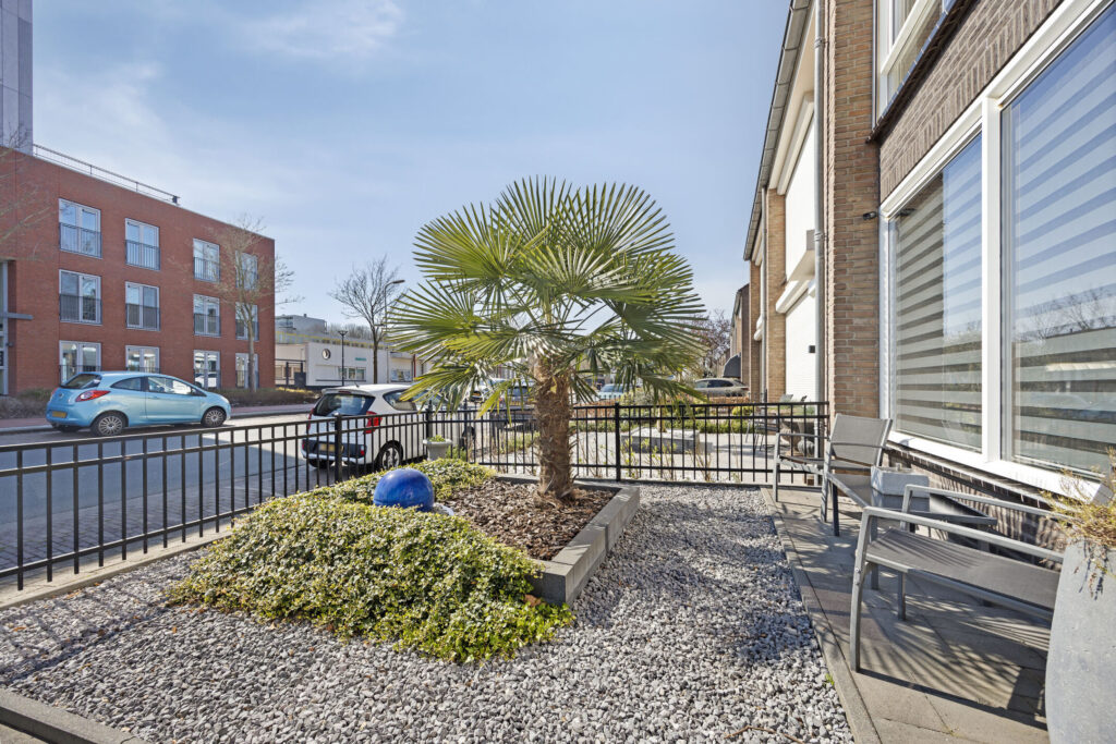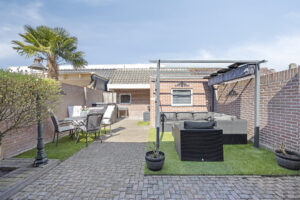 De verzorgde, onderhoudsvriendelijke achtertuin is ingericht met sierbestrating, een kunstgras gazon, een pergola en degelijke erfafscheiding. Door het ontbreken van directe achterburen is de tuin erg privacy biedend. Middels een loopdeur heeft men toegang tot de ruime garage. De royale garage met aangrenzende berging is ruim van formaat (totaal ca. 23 m²) en voorzien van elektra. Via een elektrisch aangedreven stalen kanteldeur met loopdeur is er toegang tot de straat. De voortuin is eveneens onderhoudsvriendelijk ingericht en omheind met een laag stalen hekwerk.