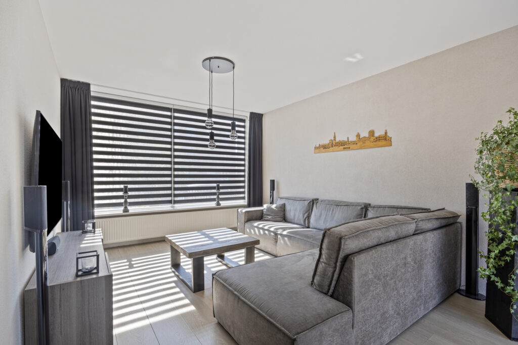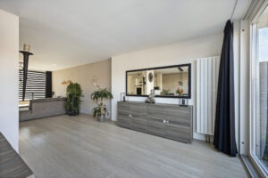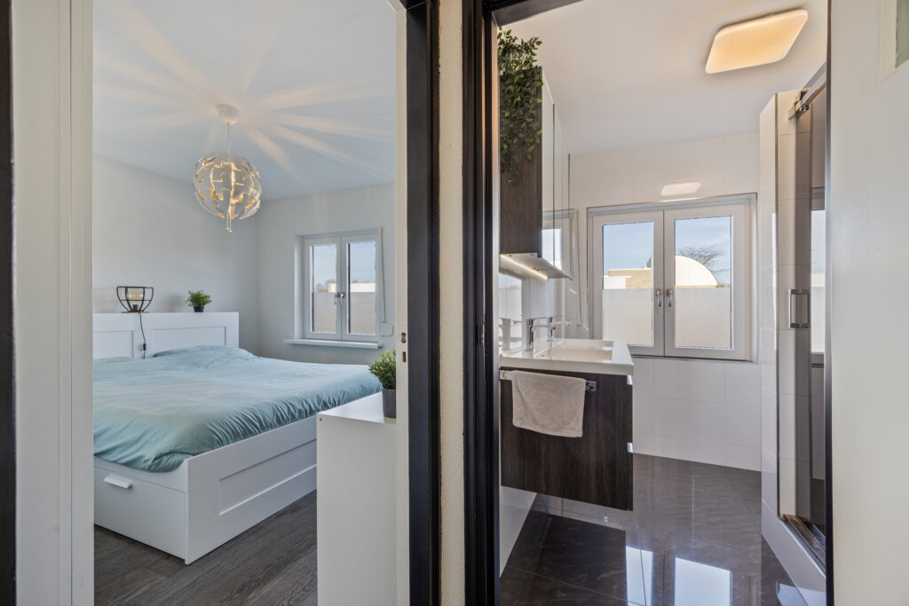 - Badkamer, modern, geheel betegeld en voorzien van een douchecabine met regen- en handdouche, een hangcloset, een dubbele wastafel in meubel evenals een grote spiegelkast. Tevens is er een rolluik aanwezig (handbediend).