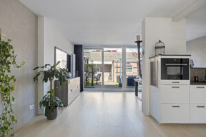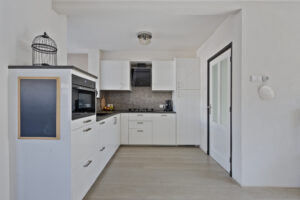 Hal/entree met trapopgang naar de eerste verdieping, toiletruimte volledig betegeld met hangcloset, verdiepte trapkast met meterkast en toegang tot de woonkamer; de uitgebouwde woonkamer heeft veel natuurlijk lichtinval door de grote raampartijen en biedt toegang tot de tuin middels een schuifpui. De moderne keukeninrichting in hoekopstelling is uitgevoerd met diverse boven- en onderkasten. Aan inbouwapparatuur is aanwezig: een combi-oven magnetron, een vaatwasser, een 5-pits gaskookplaat, een afzuigkap en een koelkast.