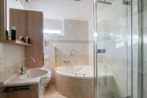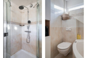 Alle slaapkamers en de overloop zijn voorzien van een laminaatvloer en alle slaapkamers zijn voorzien van rolluiken. Slaapkamer I gelegen aan de achterzijde van de woning; Ruime slaapkamer II gelegen aan de achterzijde van de woning; Riante ouderslaapkamer III gelegen aan de voorzijde van de woning. Volledig betegelde badkamer gelegen aan de voorzijde van de woning hier treft u een hoekbad met jets, douche, hangend closet en een wastafelmeubel.