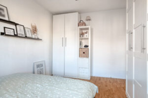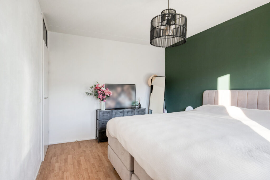Ruime slaapkamer IV voorzien van een laminaatvloer en een grote raampartij met elektrisch rolluik.