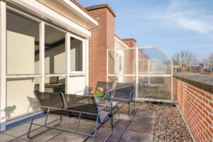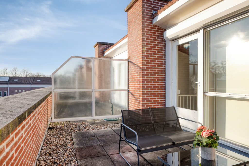 Zonnig en riant dakterras gelegen aan de voorzijde van de woning, welke voorzien is van tegels en kiezelstenen. Een plek waar je op een zonnige dag heerlijk van de zon kunt genieten.
