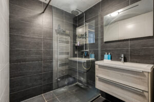 - De badkamer is volledig betegeld en voorzien van douche, wastafel in meubel en handdoekenradiator.