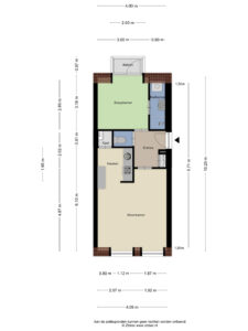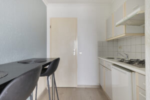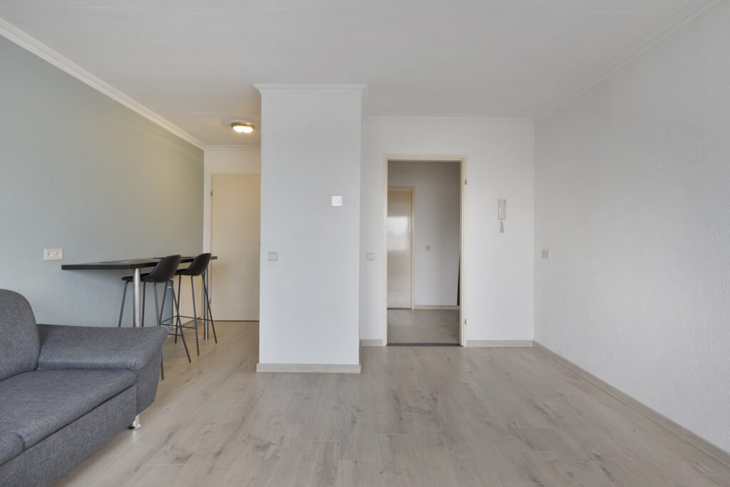 Hal met entree, meterkast, toiletruimte; ruime woonkamer aan de voorzijde (ca. 20m², 4.60 x 4.10m); open keuken met keukenblok voorzien van 4-pits gaskookplaat, afzuigkap en koelkast (ca. 2.00 x 1.55m); vaste kast met opstelplaats van de cv-ketel; slaapkamer I aan de achterzijde met toegang tot het balkon (ca. 3.25 x 3.00m en balkon ca. 1.00 x 1.70m); badkamer voorzien van douchecabine, wastafelmeubel en aansluiting wasapparatuur (ca. 2.40 x 0.90 m).