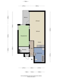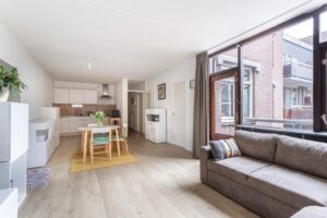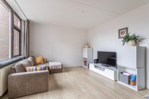 Meterkast naast voordeur in het portiek; entree met intercom en toegang tot alle vertrekken; toiletruimte; inpandige berging met opstelplaats cv-ketel (ca. 2.70 x 1.50 m); ruime en lichte woonkamer met toegang tot het balkon (ca. 27 m², 7.20 x 3.80 m); balkon (ca. 3.50 x 1.50 m); open keuken met keukenblok voorzien van onder- en bovenkasten, aansluiting kookplaat en afzuigkap (ca. 2.70 x 2.00 m); grote slaapkamer aan de achterzijde (ca. 5.45 x 2.70 m); badkamer voorzien van ligbad, wastafelmeubel, toilet en aansluiting wasapparatuur (ca. 3.70 x 2.50 m)
