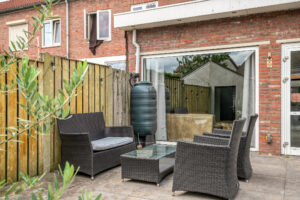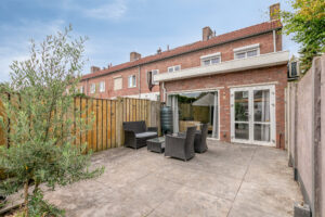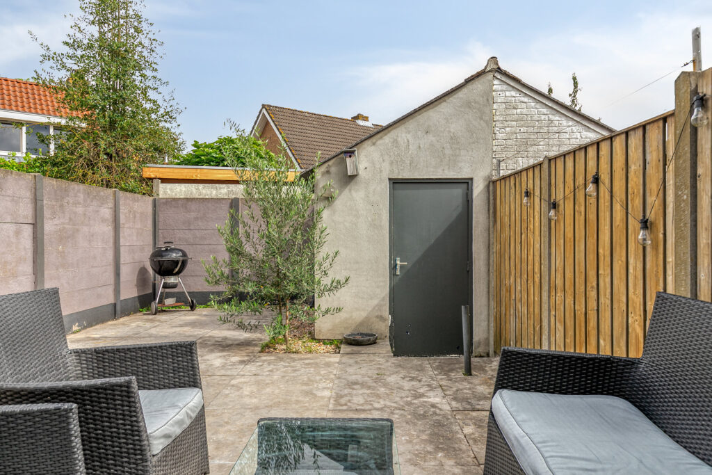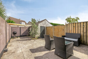 Achtertuin met berging en achterom. De tuin is aangelegd met grote terrastegels, degelijke erfafscheiding en is zo goed als onderhoudsvriendelijk. Verder beschikt de tuin over een buitenkraan en enkele stopcontacten.