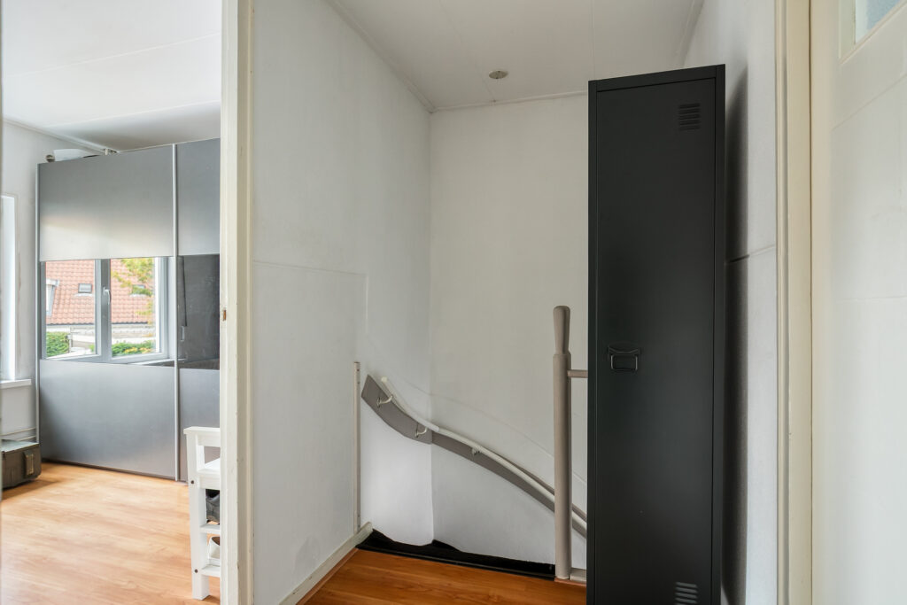 Overloop met houtenvloer, toegang tot de 3 slaapkamers en middels vlizotrap toegang tot de bergzolder;