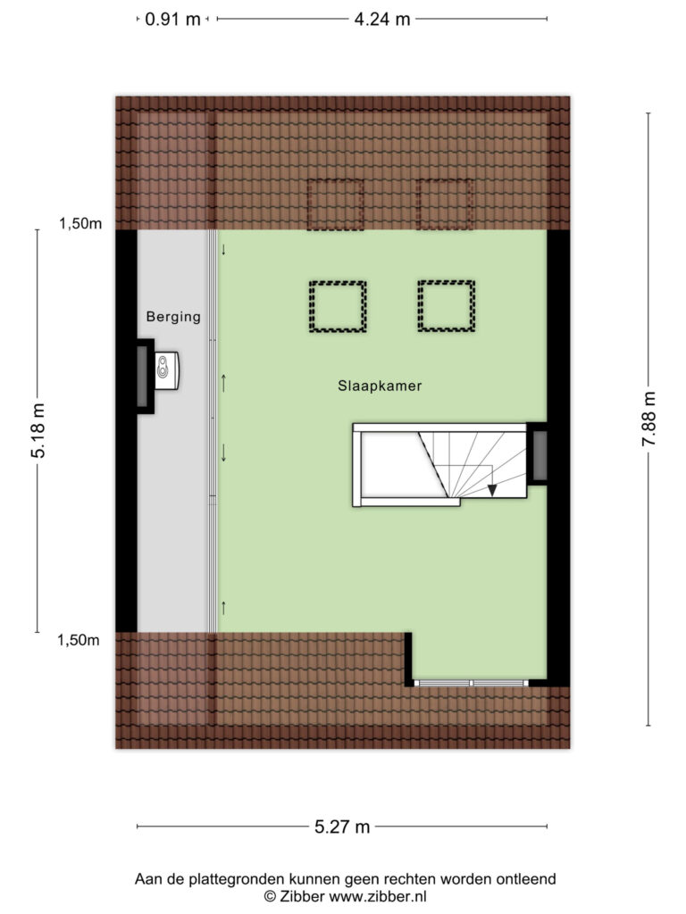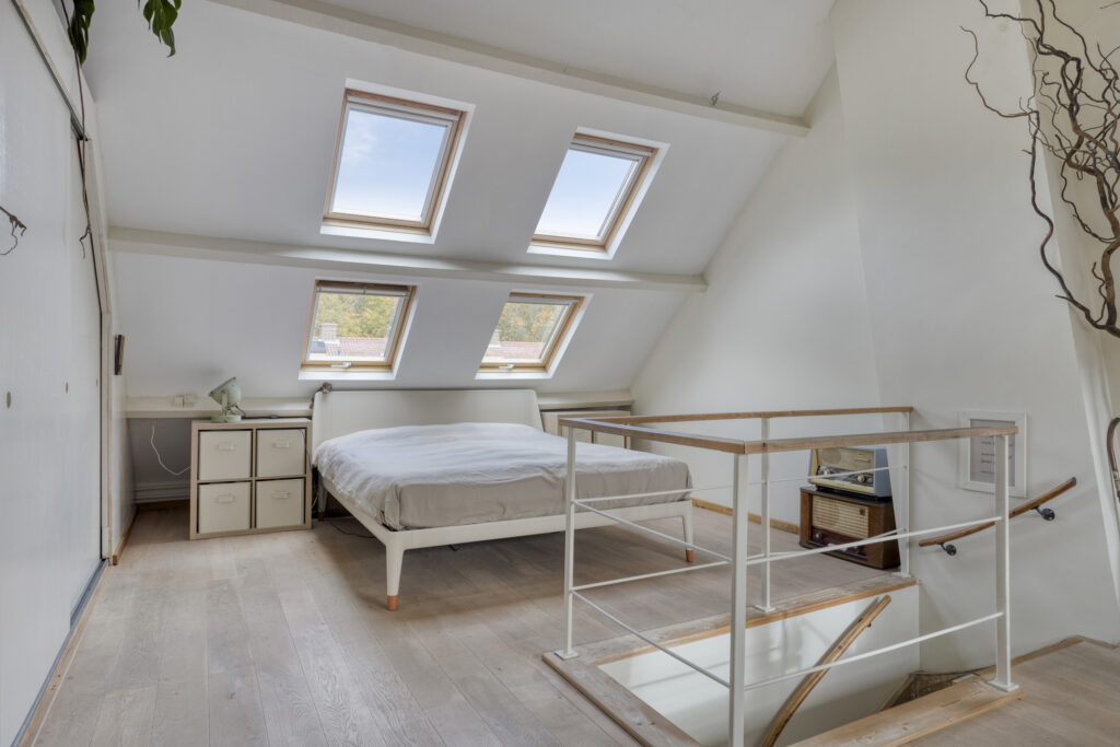 Open slaapkamer IV (afm. ca. 5.18m x 5.27) met vaste kastenwand en 4 Velux dakramen. Aan de voorzijde is er een kleine dakkapel aanwezig.