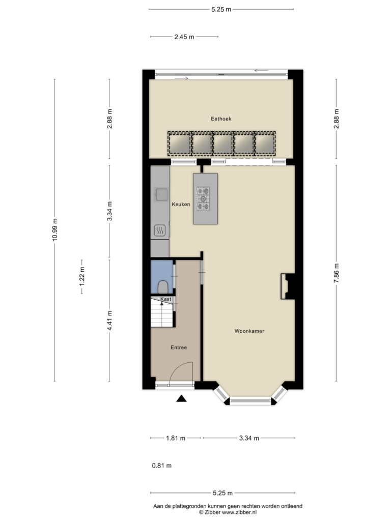 Entree (met originele vloer) met toegang tot de toiletruimte (vergroot) met hangcloset, trapopgang, verdiepte trapkast met moderne meterkast en de woonkamer. Ruime doorzonkamer met houten vloer, haard in schouw en sfeervolle erker aan de voorzijde. De open keuken met tegelvloer is voorzien van een inrichting in rechte opstelling met schiereiland. Aan inbouwapparatuur is aanwezig een gaskookplaat, magnetron, heteluchtoven, zwevende afzuigkap, koel/vriescombinatie en een vaatwasser. De uitbouw is voorzien van een lichtstraat, spotverlichting en heeft een fraaie tegelvloer met vloerverwarming. Via een grote schuifpui is er toegang tot de tuin.