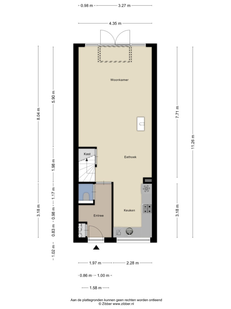 Entree/hal met meterkast en toiletruimte; uitgebouwde woonkamer (ca. 33 m², 4.35 x 7.71 m) met lichtkoepel openslaande deuren naar de tuin, houtkachel, trapkast en trapopgang naar de eerste verdieping; open keuken (ca. 2.28 x 3.18m) gelegen aan de voorzijde en voorzien van hoekopgestelde keukeninrichting voorzien van 4-pits gaskookplaat, vaatwasser, afzuigkap, oven en spoelbak.