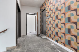 - Toiletruimte, gedeeltelijk betegeld met hangend closet en fonteintje;