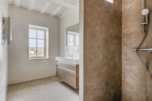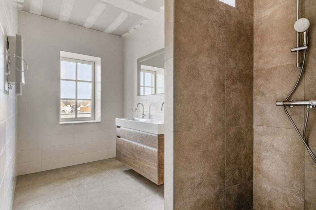 - Moderne, volledig betegelde badkamer voorzien van inloopdouche en groot wastafelmeubel met dubbele kraan;