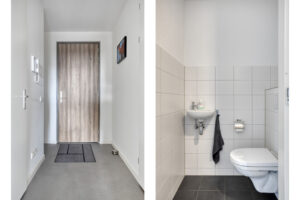 Entree/ontvangsthal met meterkast en de video/intercom installatie. Gasten toiletruimte met een vrij hangend closet en fonteintje. Aparte wasruimte/stookruimte met aansluitingen ten behoeve van de wasapparatuur en opstelplaats van de technische installatie (WTW en warmtepomp).