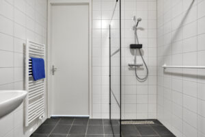 Riante en volledig betegelde badkamer voorzien van inloopdouche, 2e toilet, wastafel en een handdoekradiator.