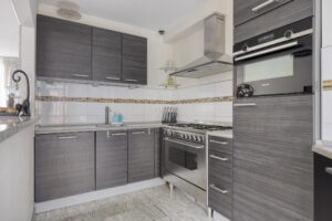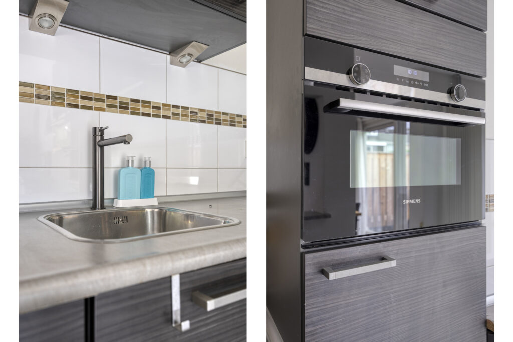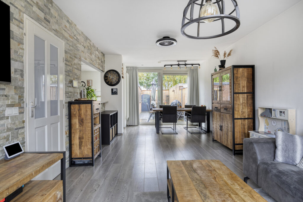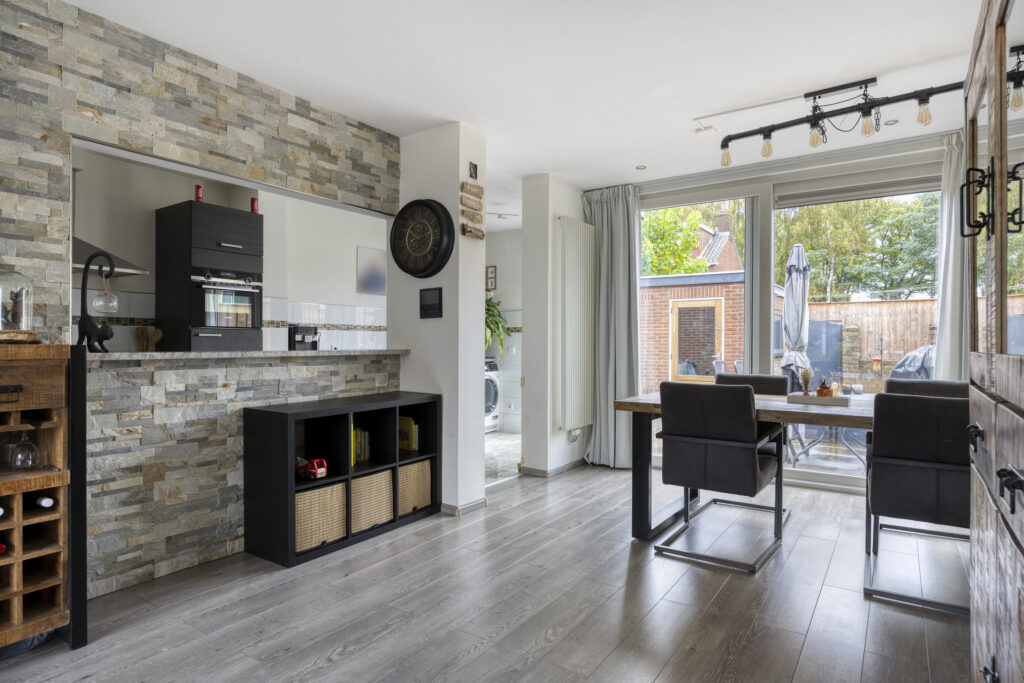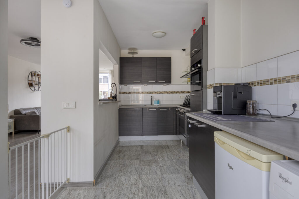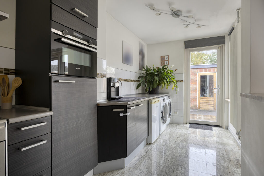 Hal/ entree voorzien van een tegelvloer, trapopgang naar de eerste verdieping, meterkast, trapkast met veel opbergruimte en de deels betegelde toiletruimte met staand closet en fonteintje.Lichte en ruime woonkamer voorzien van een laminaatvloer en strakke stucwerk wanden en plafond. Vanuit de woonkamer heeft u middels een schuifpui (met hor en rolluik) toegang tot de achtertuin. Semi-open en uitgebouwde keuken, voorzien van een L-vormige inrichting in een moderne kleurstelling voorzien van een 5-pits gasfornuis met grote oven (Smeg), afzuigkap, RvS spoelbak, koelkast, vaatwasmachine en combimagnetron. De keuken is tevens voorzien van onder- en bovenkasten met veel opbergruimte. Aan de achterzijde van de keuken is de aansluiting voor de was- en droogapparatuur en een loopdeur die toegang biedt naar de achtertuin.