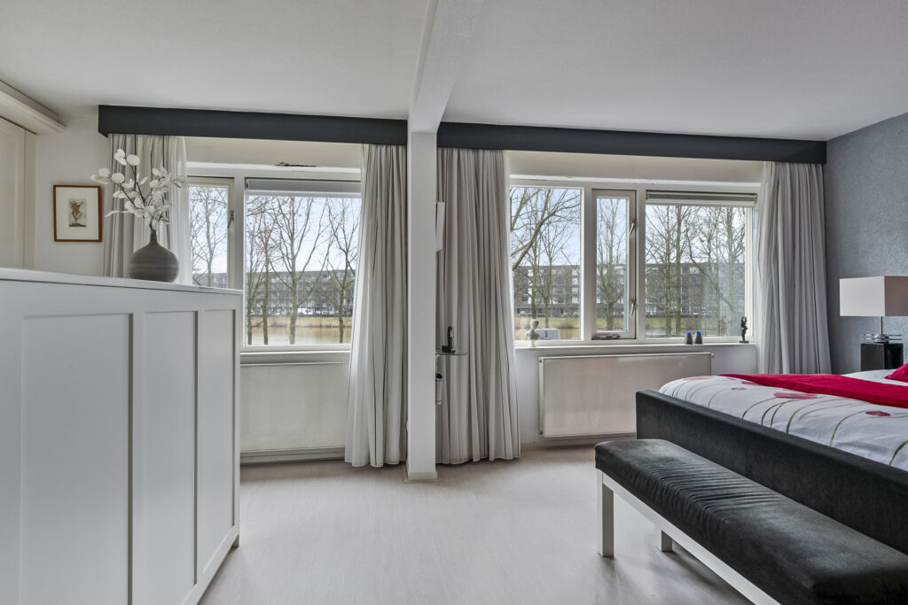 * Riante slaapkamer (oorspronkelijke twee slaapkamers). Deze slaapkamer ligt aan de achterzijde en heeft zowel aan de voorzijde als aan de zijkant een raam waardoor het een hele lichte kamer is. Er is een grote vaste kast aanwezig en de ramen zijn voorzien van elektrische screens.