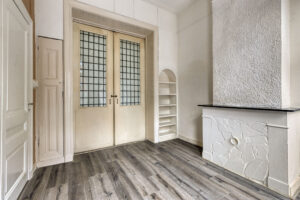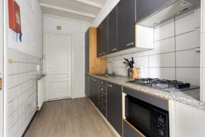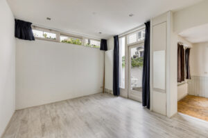 Slaapkamer I gelegen aan de voorzijde van de woning met een plafondhoogte van ruim 3 meter, schouw en inbouwkasten. Eenvoudige keuken in een rechte opstelling voorzien van onder- en bovenkasten, 4-pits gaskookplaat, afzuigkap, combi-oven en spoelbak. Slaapkamer II / woonkamer vanuit de keuken bereikbaar, ruime woonkamer met aansluitend slaapkamer voorzien van laminaatvloer, schouw, schuifdeuren en vaste kasten.