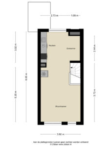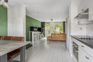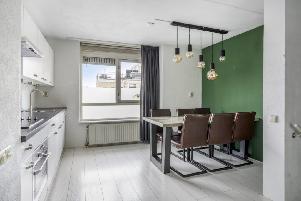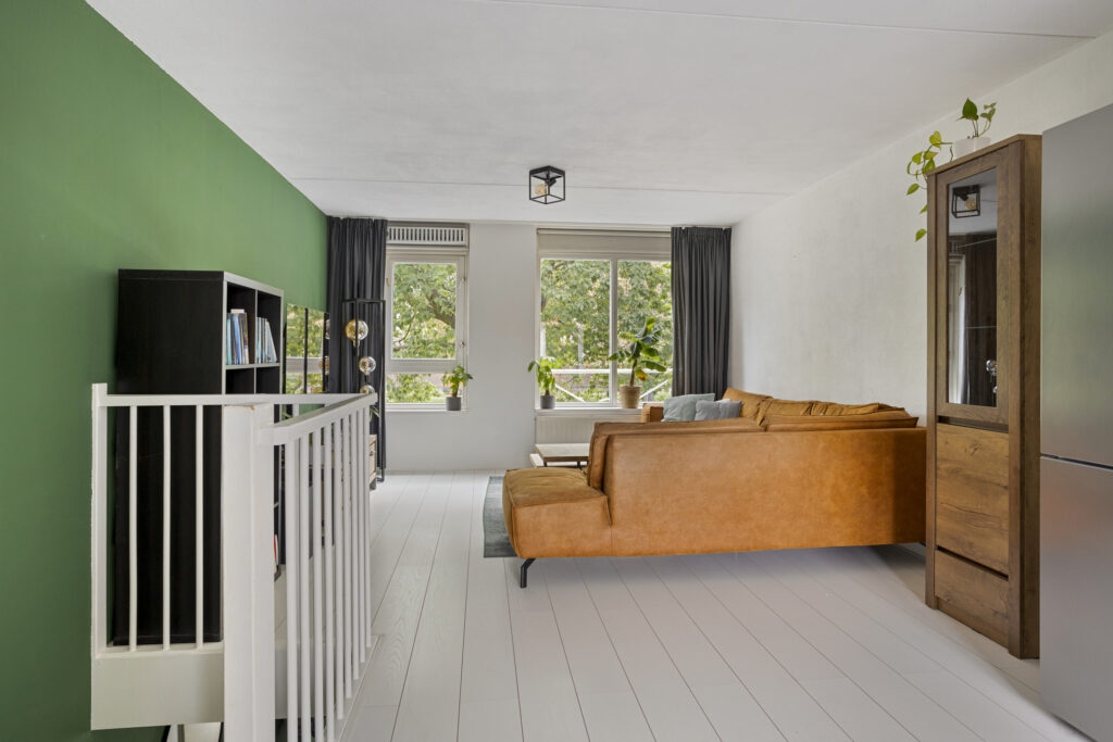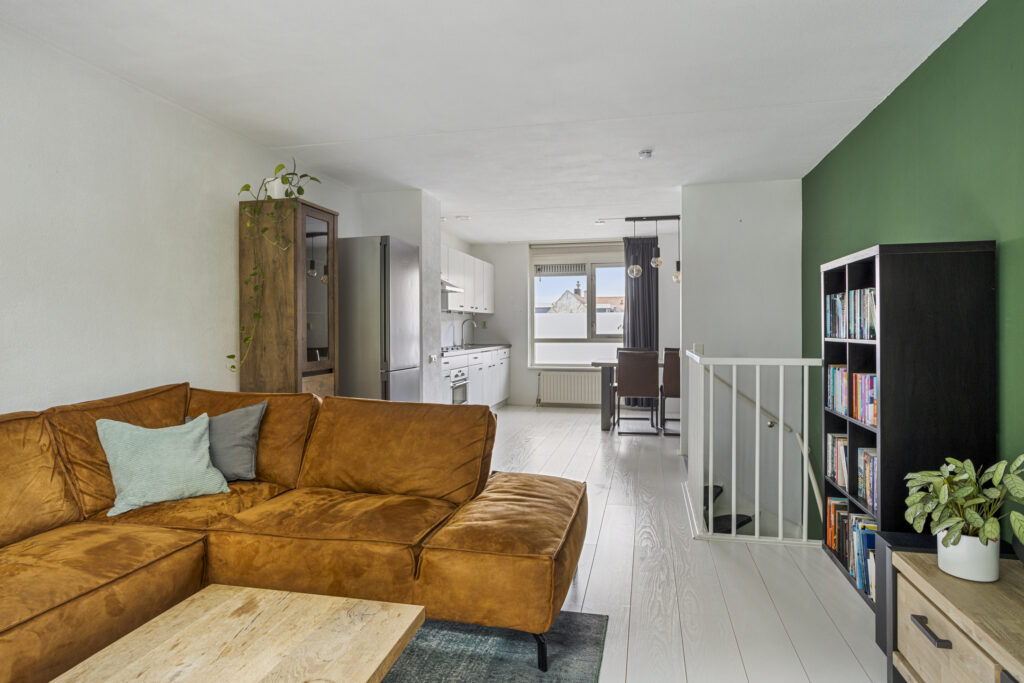 Via de trapopgang bereikt u de ruime en lichte living en keuken. De zitkamer is gelegen aan de voorzijde biedt een fraai uitzicht over de Singel. De open keuken is gelegen aan de achterzijde met onder- en bovenkasten in een rechte wandopstelling. ls inbouwapparatuur is hier aanwezig; vaatwasmachine, combi-oven, keramische kookplaat met afzuigkap. De keuken biedt voldoende ruimte voor het plaatsen van een grote eetkamertafel.