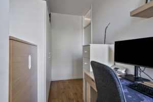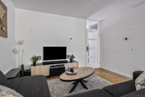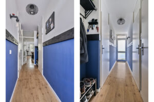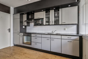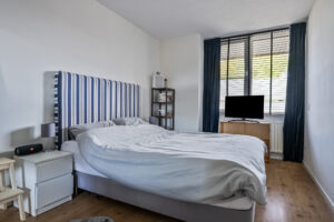 Hal met entree welke toegang biedt tot de ruime slaapkamer I gelegen aan de galerijzijde; kantoor/slaapkamers II tevens gelegen aan de galerijzijde. Moderne en fraaie badkamer (2023) voorzien van ruime douche, waskom met meubel en verwarmde spiegel, hangend closet, elektrische handdoek verwarming en elektrische vloerverwarming; Ruime woonkamer met voldoende ruimte voor een gezellige zithoek en een grote eetkamertafel. Vanuit de woonkamer heeft u toegang tot het zonnige balkon met een fraai uitzicht en voorzien van een elektrisch zonnescherm; Nette open keuken in een recht opstelling voorzien van onder- en bovenkasten, dubbele spoelbak, 4-pits keramische kookplaat, afzuigkap, magnetron, oven, koelkast met vrieslades (2022) en vaatwasmachine (2024) ; Vanuit de keuken is de bijkeuken bereikbaar hier treft u de aansluiting voor de was- en droogapparatuur, mechanische ventilatie (vernieuwd in 2022) en veel opbergruimte. Op de galerij is de meterkast gesitueerd.