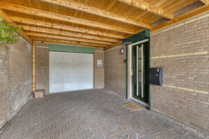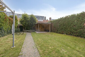 De woning heeft een verzorgde, privacy biedende achtertuin op het oosten van ca. 16m diep. De tuin beschikt over een terras, een gazon en diverse borders met vaste beplanting. Verder beschikt de tuin over degelijke erfafscheiding, een pergola, buitenverlichting, diverse stopcontacten en een zonnescherm. Via een loopdeur is er toegang tot de garage. Via een poort is de achterom te bereiken. Achterin de tuin treft men de overkapping met aangrenzende berging.