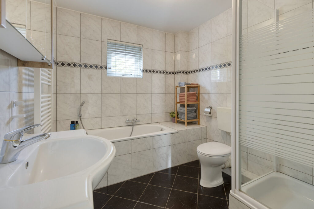 - Badkamer, gelegen aan de voorzijde, betegeld, met design radiator, zwevend closet, ligbad, douchecabine, wastafel en ventilatie.