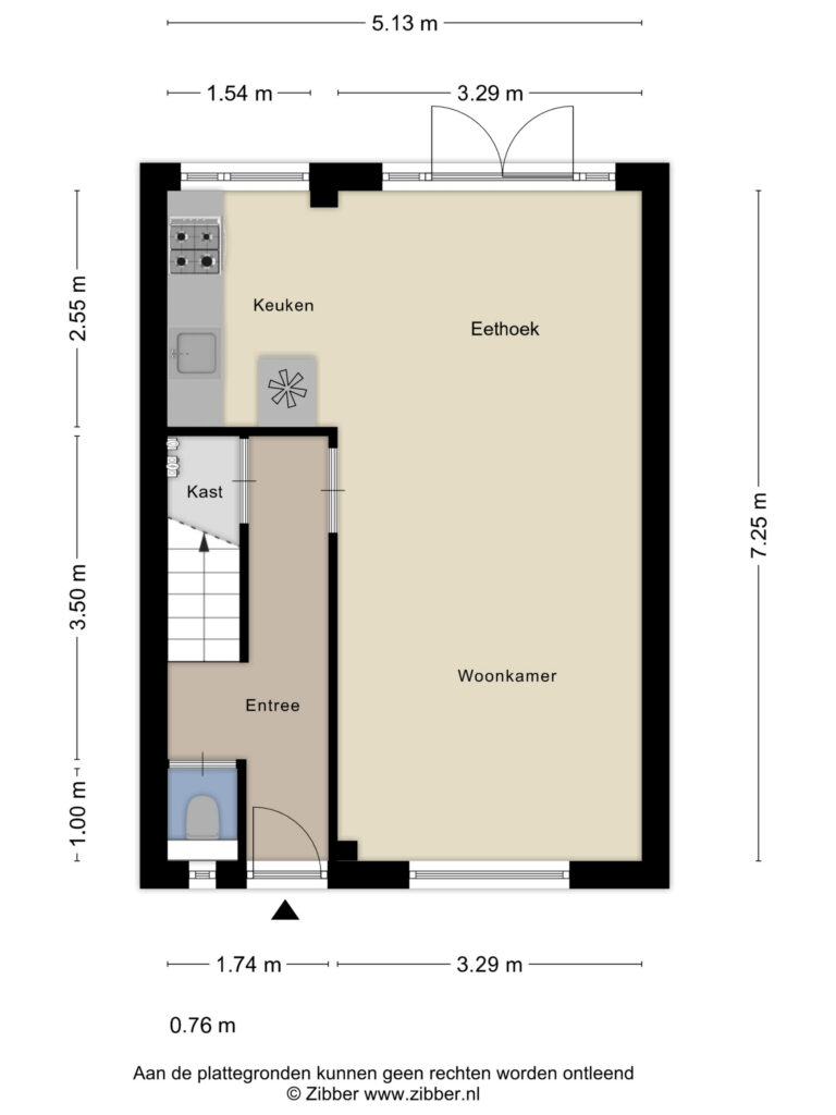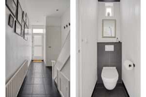Entree/hal met toegang tot de verdiepte kelderkast voorzien van uitgebreide meterkast; moderne deels betegelde toiletruimte met hangcloset, inbouwverlichting en een uitzetraam; trapopgang naar de eerste verdieping.
