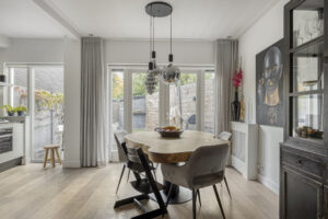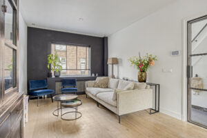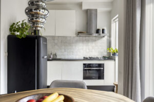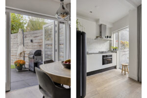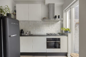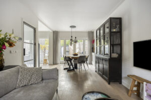 De sfeervolle en lichte woonkamer met houten vloerdelen (lamelparket) staat in open verbinding met de keuken. Middels openslaande tuindeuren heeft u toegang tot de achtertuin. De open keuken is gelegen aan de achterzijde van de woning en o.a. voorzien van een combi-oven (2025), afzuigkap, 4-pits gaskookplaat, vaatwasser (2025), spoelbak en een composiet aanrechtblad. Losstaande Smeg koelkast met vriesvak (blijft achter). In de keuken is een groot vast raam aanwezig met uitzicht op de tuin.