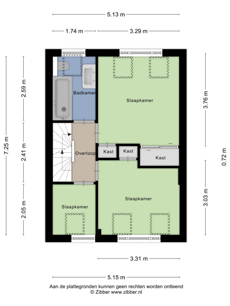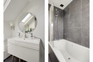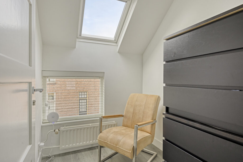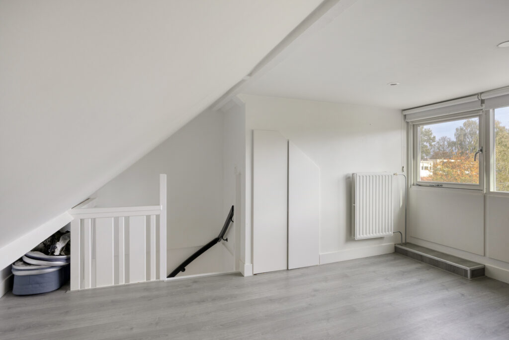 De overloop met toegang tot 3 slaapkamers en de badkamer. De vloeren zijn voorzien van laminaat en middels een vaste trap is er toegang tot de zolderverdieping. Slaapkamer I is gelegen aan de achterzijde van de woning en heeft een 2 royale vaste kledingkasten. Er is veel lichtinval door de twee extra Velux dakramen in het dakvlak. Slaapkamer II heeft een vaste kast en is gelegen aan de voorzijde, ook hier is weer extra lichtinval door twee Velux dakramen. De kleinere slaapkamer III is gelegen aan de voorzijde en heeft tevens een Velux dakraam. De moderne en deels betegelde badkamer heeft een royaal ligbad met douchearmatuur en een glazen spatscherm. De duo wastafel is voorzien van een brede onderlade. Tevens is er een hangend closet aanwezig. De badkamer heeft een uitzetraam en een Velux dakraam.