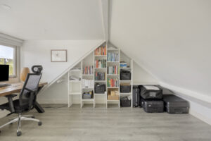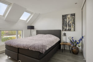 De royale slaapkamer IV bevindt zich onder de schuine geïsoleerde kap en is voorzien van een dakkapel. Er is een bergkast aanwezig met daarin de CV-combiketel (Atag 2009) en aansluitpunt voor de wasapparatuur en extra opbergruimte.