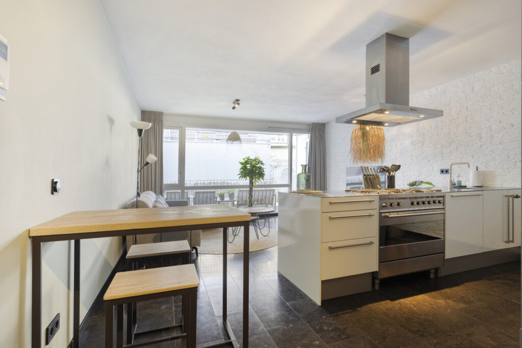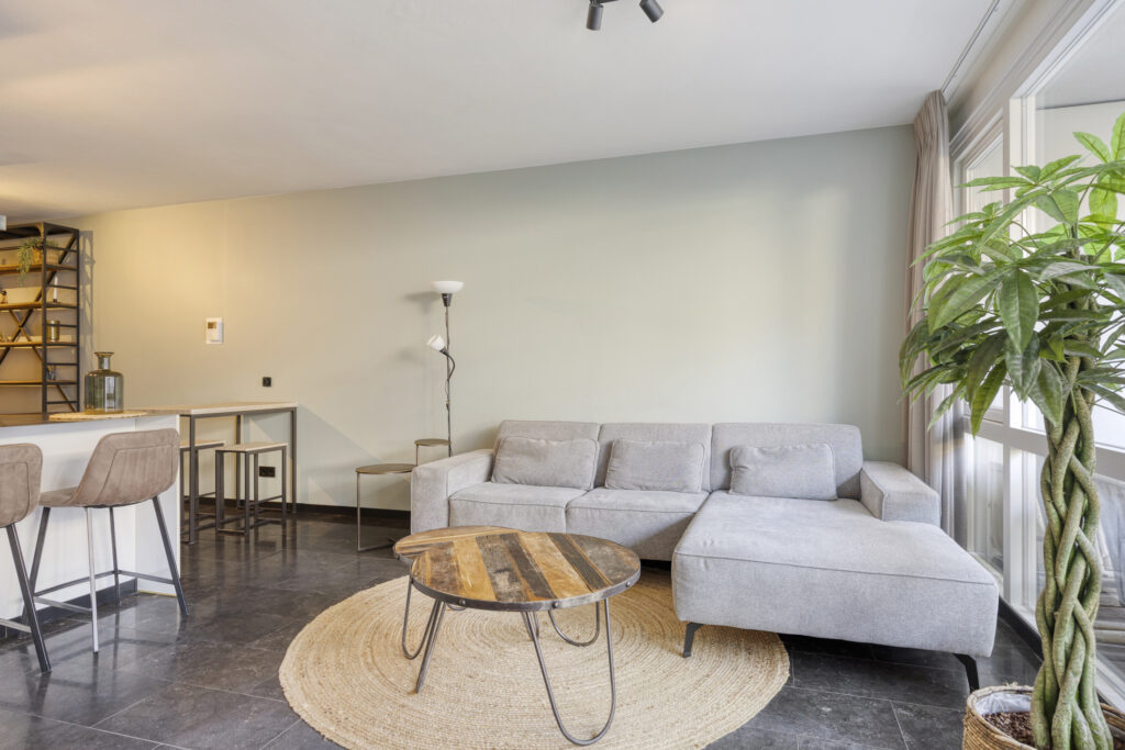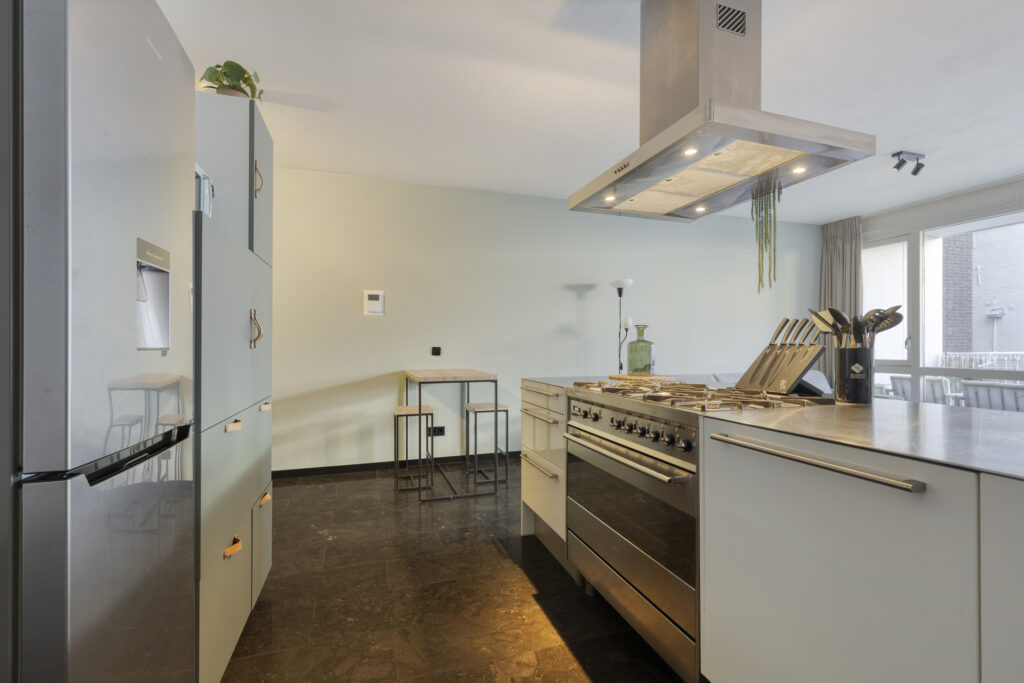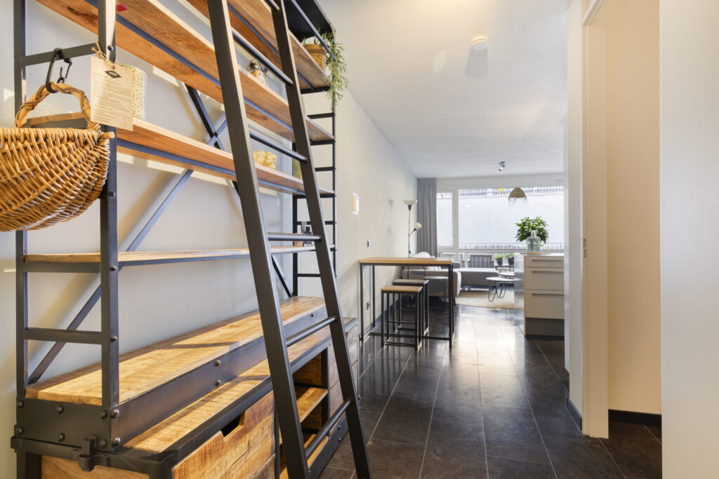 Hal-/entree voorzien van natuurstenen tegelvloer, vernieuwde meterkast (6 groepen en 2 aardlekschakelaars), toegang tot de stookruimte, wasruimte, toilet en living. Stookruimte met opstelplaats HR combiketel Remeha Avanta (2010). Wasruimte met aansluitingen ten behoeve van wasapparatuur. Toilet met zwevend toilet, fonteintje en mechanische ventilatie. Living voorzien van natuurstenen tegelvloer, open keuken, toegang tot de slaapkamer en loopdeur naar het ruime balkon. Moderne keuken voorzien van kookeiland met verzonken spoelbak, 6-pits gasfornuis met oven, recirculatieafzuigkap, vaatwasser en Amerikaanse koelkast. Slaapkamer met directe toegang tot de badkamer. Badkamer met wastafelmeubel, douchecabine en mechanische ventilatie.