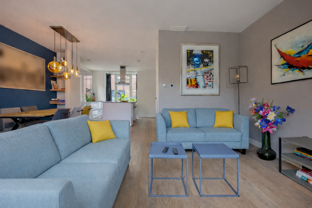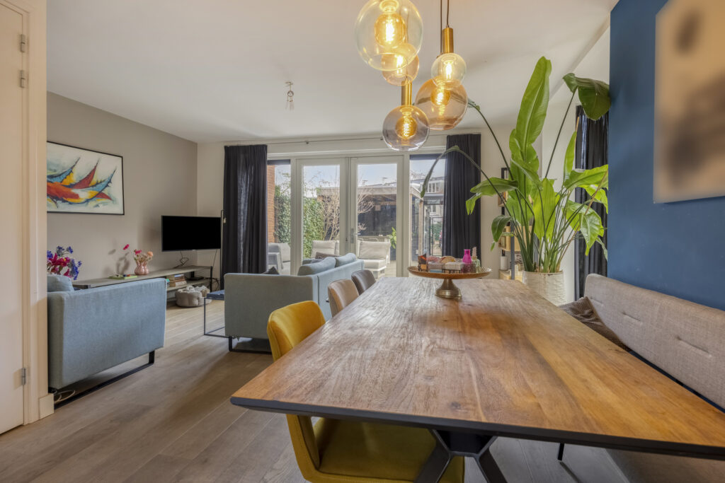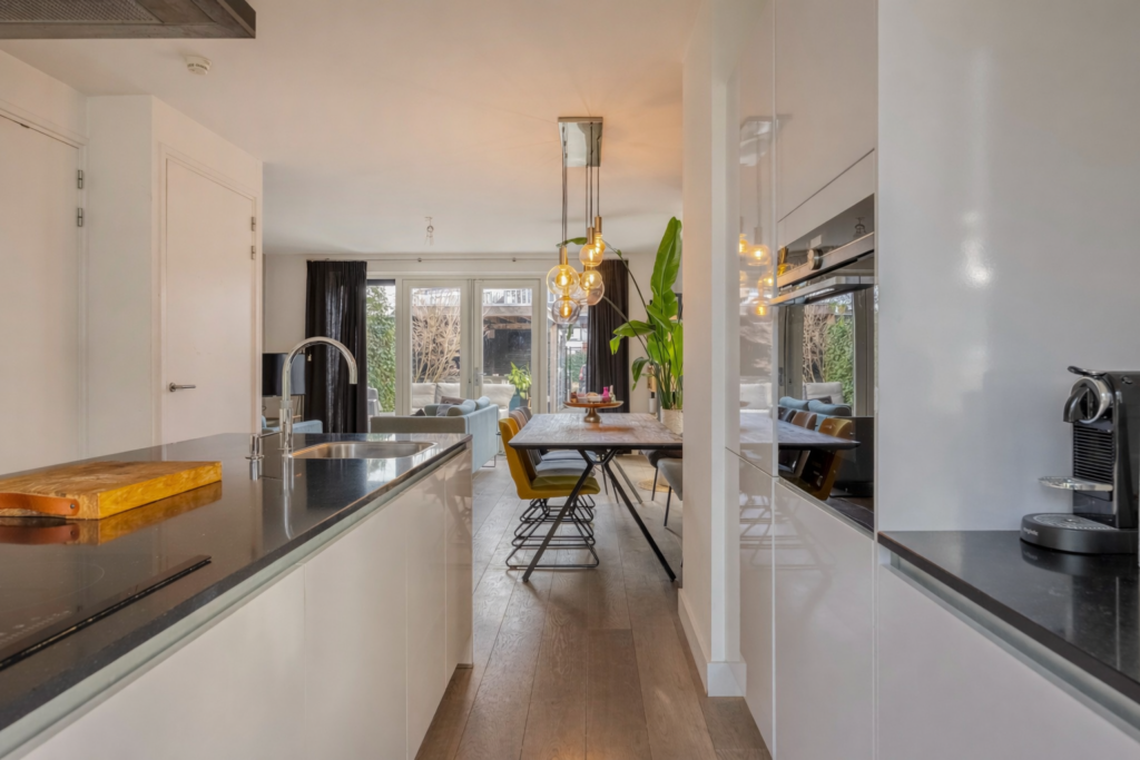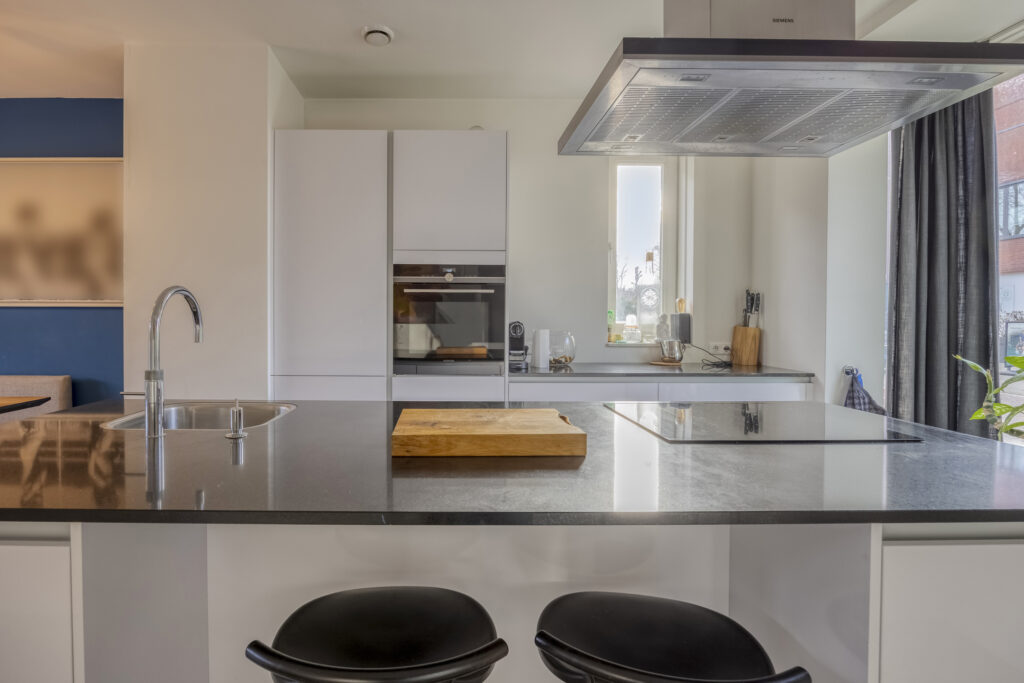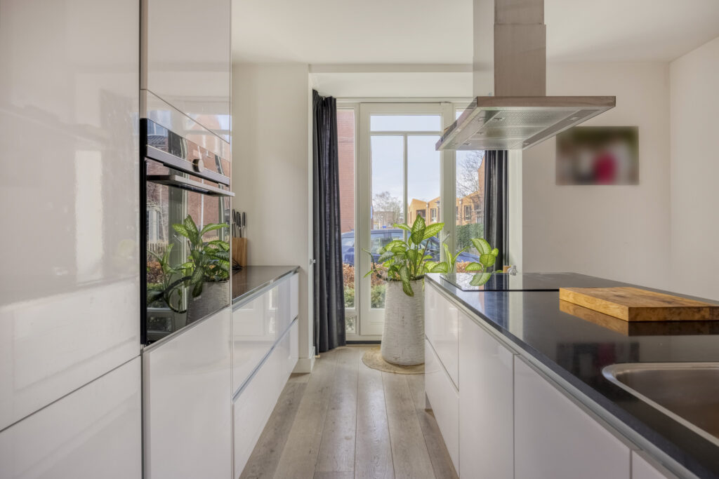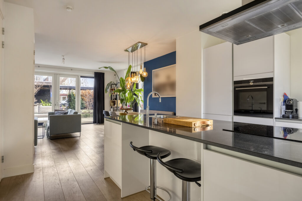 Middels een loopdeur is de living/keuken bereikbaar. Fraaie keuken gelegen aan de voorzijde van de woning. De keuken is voorzien van een groot kookeiland met composiet werkblad, als apparatuur is hier aanwezig; 4 pits inductiekookplaat, afzuigkap, Quooker, vaatwasmachine en veel opbergruimte in de kasten en lades, In de wandopstelling van de keuken is o.a. aanwezig; koelkast, vrieslades, combi-oven en tevens veel opbergruimte in de kasten en lades. Een leuk detail van deze woning zijn de erkers aan de voorzijde en zijkant van de woning. Aan aan achterzijde van de living is een ruime zithoek aanwezig met uitzicht op de tuin. Middels openslaande tuindeuren is de achtertuin bereikbaar. Tevens is er een praktische trapkast aanwezig met extra opbergruimte. Op de vloer van de gehele begane grond ligt een lamelparket met daaronder vloerverwarming en de wanden zijn afgewerkt met strak stucwerk.