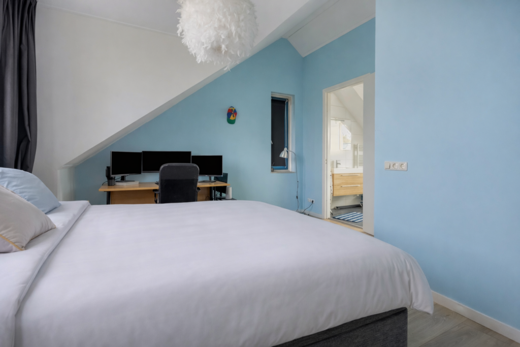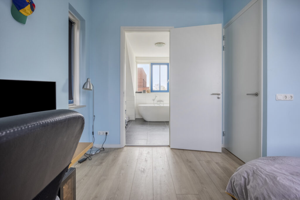 Middels een vaste trap bereikt u de ruime tweede verdieping. Overloop met de opstelplaats voor de was- en droogapparatuur, mechanische ventilatie en de Daalderop cv-ketel (bj. 2018). Tevens is er veel opbergruimte aanwezig achter de knieschotten. Riante Slaapkamer IV met dakkapel, hoge plafonds en een vaste kastenwand. Vanuit de slaapkamer is de ruime en luxe badkamer II bereikbaar. Hier treft u een inloopdouche, half vrijstaand bad, wastafelmeubel en een dakkapel.