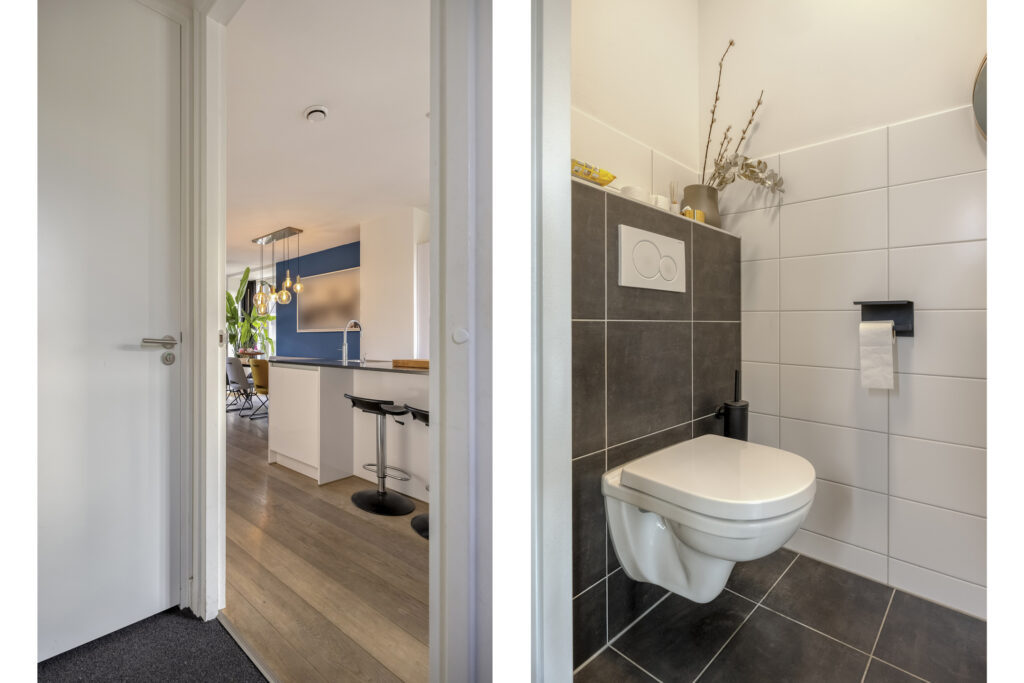 Entree, hal met toegang tot de meterkast en de deels betegelde toiletruimte met hangend closet en fonteintje.
