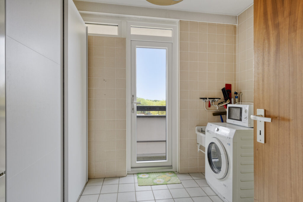 Riante woon-/-eetkamer met veel lichtinval. Via de schuifpui heeft u toegang tot het op het zuidwesten gesitueerde balkon dat beschikt over elektrische zonwering en rolluik. De woonkamer is tevens voorzien van een schouw met elektrische haard. Vanuit de woonkamer heeft u toegang tot de L-vormige keuken deze is voorzien van diverse inbouwapparatuur, te weten een 4-pits keramische kookplaat, oven, vaatwasser, koelkast, 1-1/2 spoelbak, mengkraan en afzuigkap. Middels een loopdeur heeft u toegang tot het balkon. De ruime bijkeuken is bereikbaar vanuit de hal, hier treft u de stadverwarmingsunit en opbergkasten, ook is hier de aansluiting voor de was- en droogapparatuur aanwezig alsmede een gootsteen. Via een loopdeur heeft u tevens toegang tot het balkon.