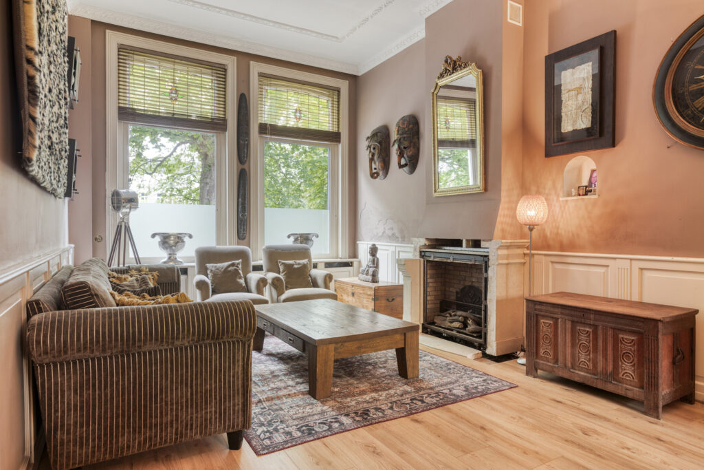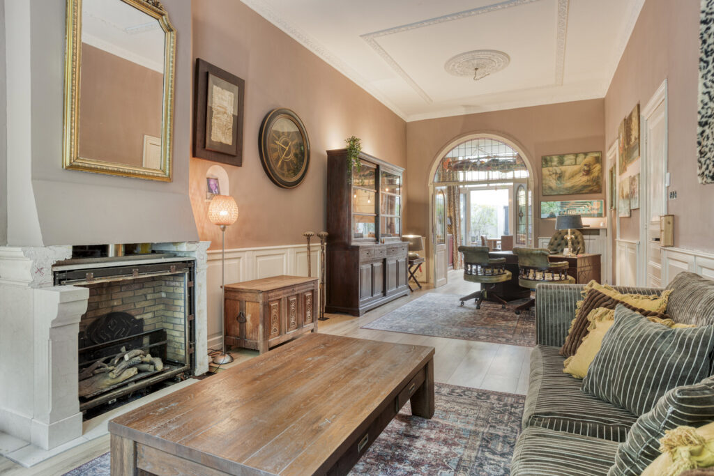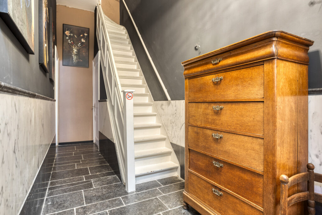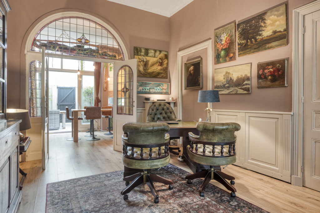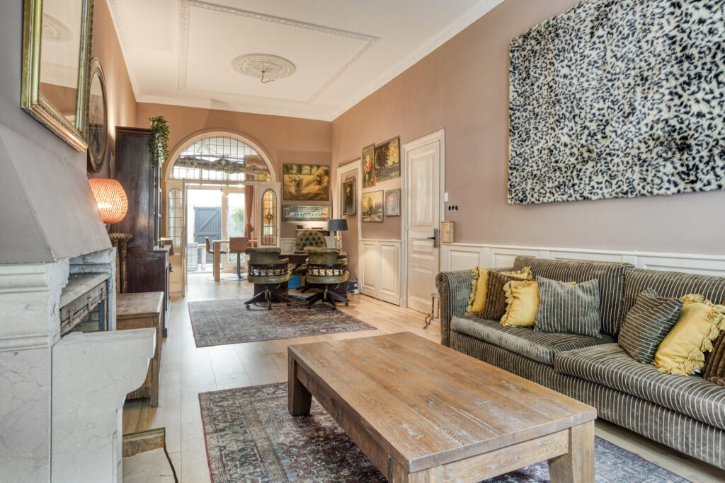 – De woning beschikt nog over diverse authentieke elementen zoals natuurstenen schouwen, hoge plafonds met sierlijsten, glas-in-lood ramen en dubbele ‘en suite’ deuren;