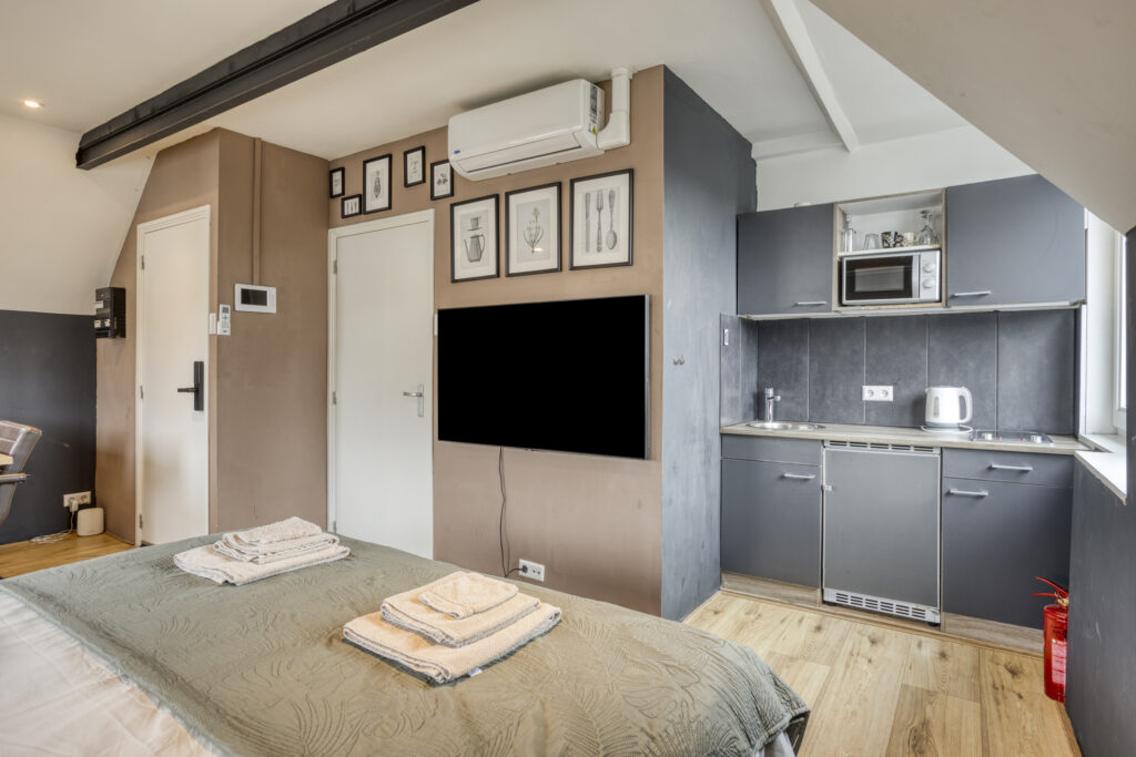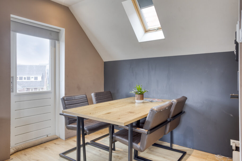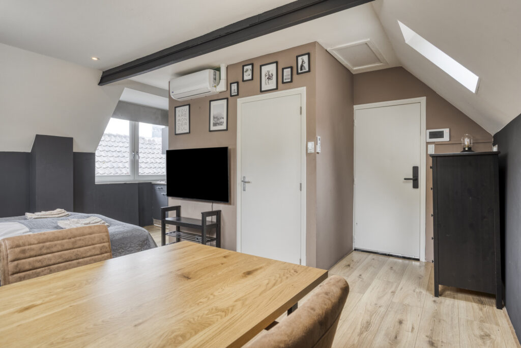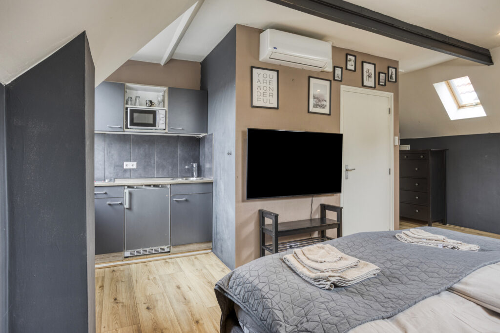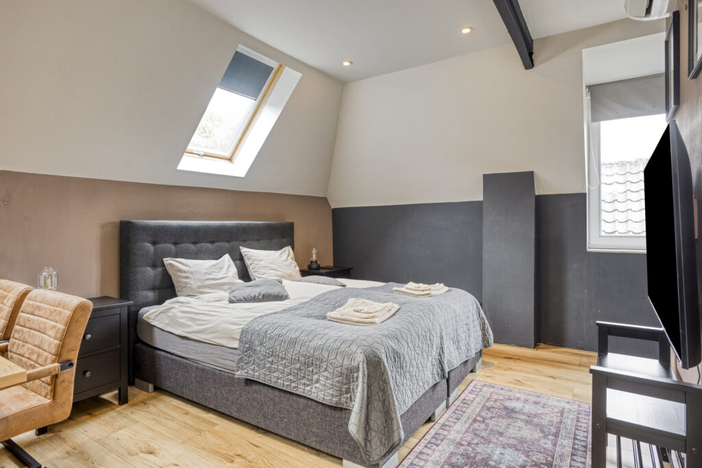 – Slaapkamer III gelegen aan de achterzijde van de woning en voorzien van een eigen moderne badkamer en kitchenette. In de badkamer treft u een douche, wastafelmeubel en een hangend closet. Tevens is er airco en een dakraam aanwezig.