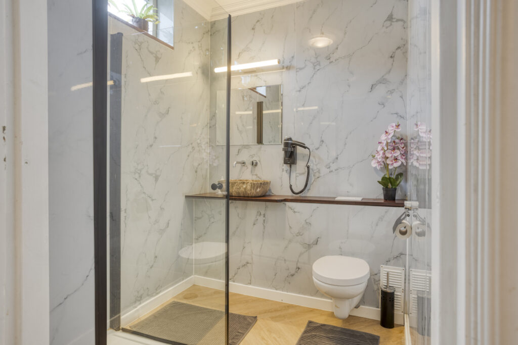 Imposante hal-/entree voorzien van hardstenen tegelvloer, marmeren wandpanelen, meterkast, vaste trap naar de eerste verdieping en loopdeur naar de living. Ruime toilet met zwevend closet en fonteintje.