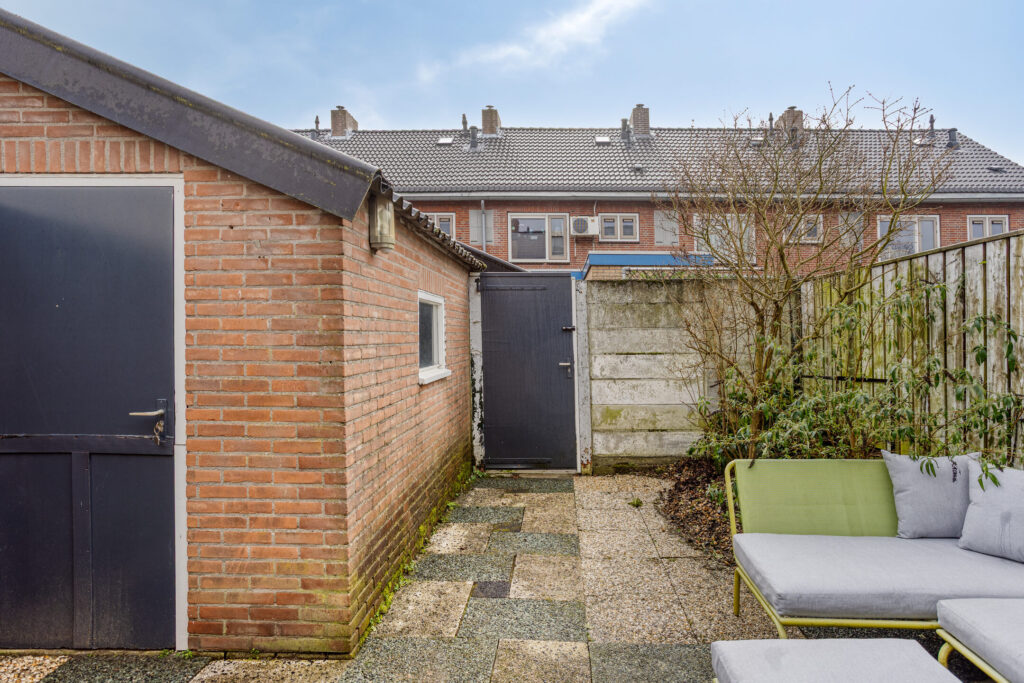De tuin is aangelegd met terrastegels, degelijke erfafscheiding en is zo goed als onderhoudsvriendelijk. Verder beschikt de tuin over een buitenkraan en een achterom. De ruime stenen berging is uitgevoerd met elektra.
