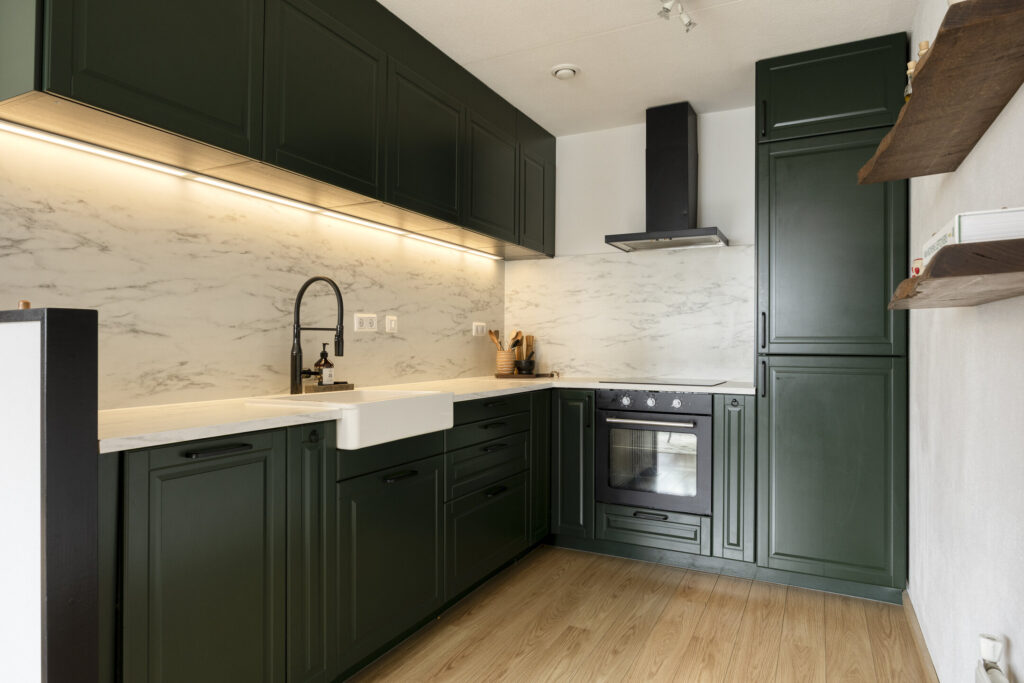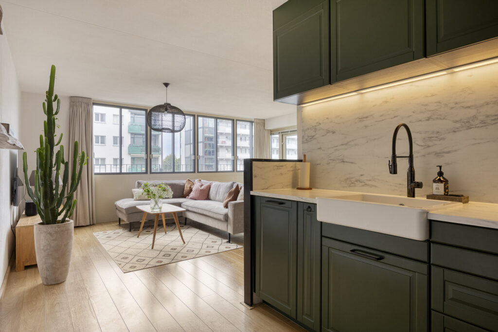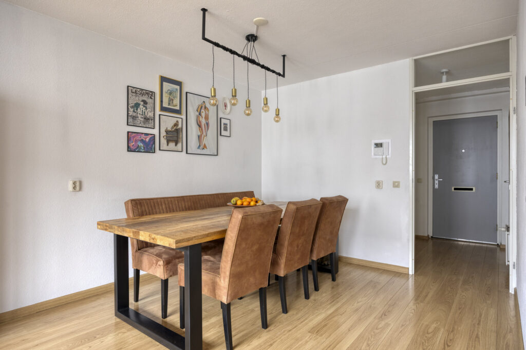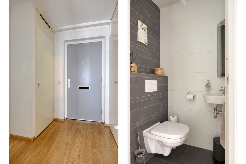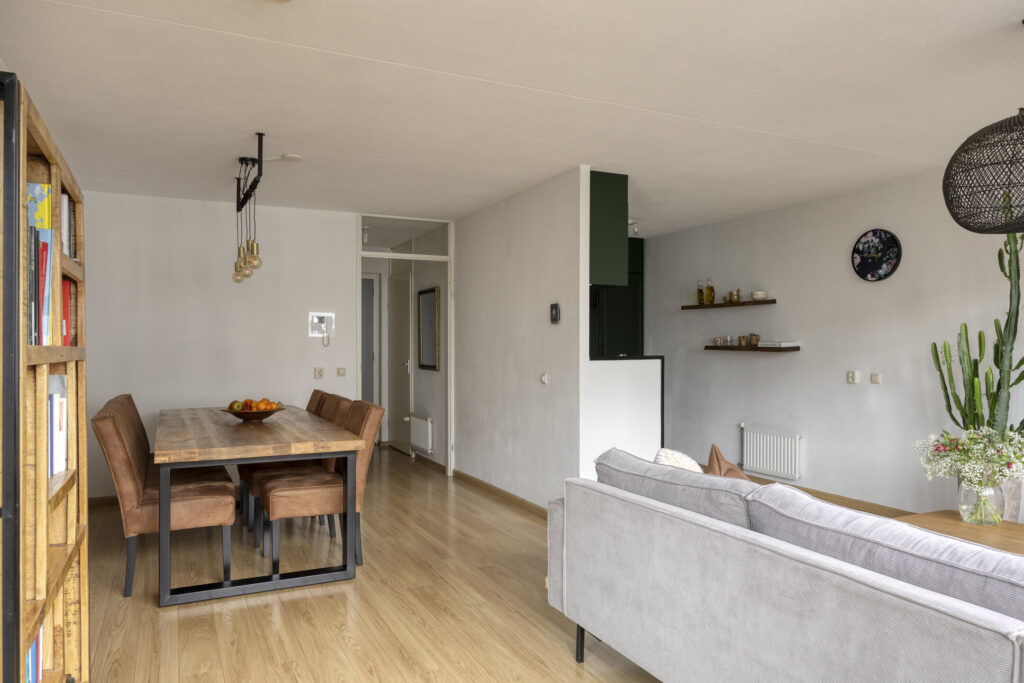 Entree/hal met meterkast en toegang tot het toilet de slaapkamers, badkamer en woonkamer. Het toilet is volledig betegeld en voorzien van een zwevend closet met fonteintje en ventilatie. De ruimtelijke woonkamer met vide intercom biedt toegang naar het balkon. Open landelijke keukeninrichting (2022) in hoekopstelling uitgevoerd met diverse boven- en onderkasten. Aan inbouwapparatuur is aanwezig: koelkast, inductiekookplaat, vaatwasser, heteluchtoven en afzuigkap. Vanuit de hal is eveneens bereikbaar: