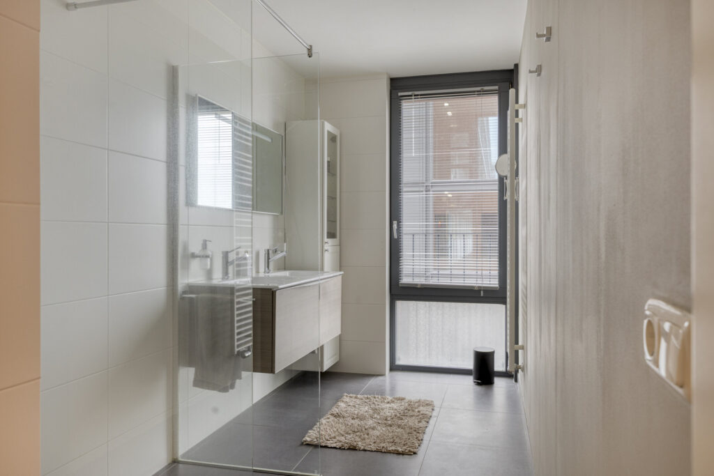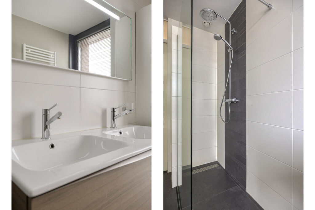 – Moderne badkamer: volledig betegeld, met design (handdoeken)radiator, inloopdouche met regendouche, dubbele wastafel en ventilatie;