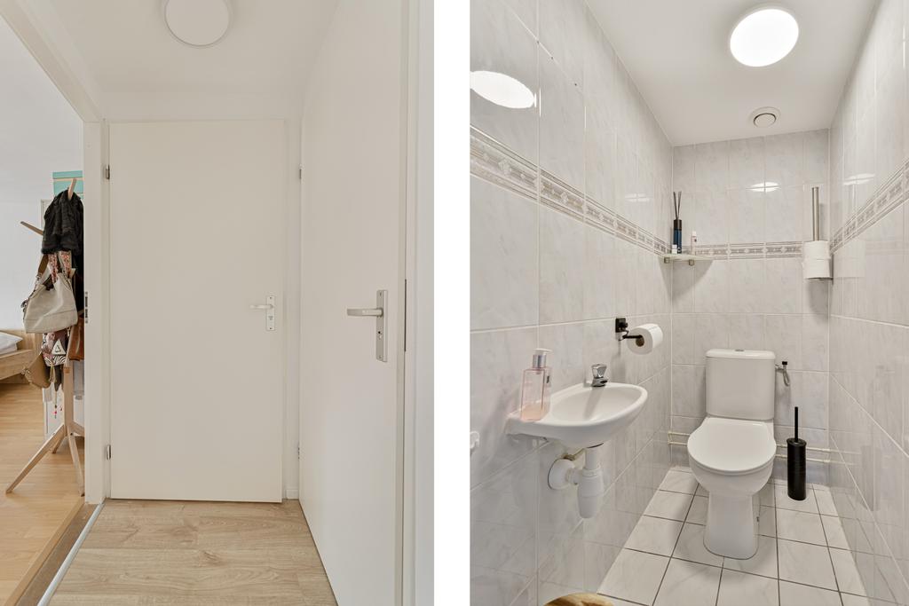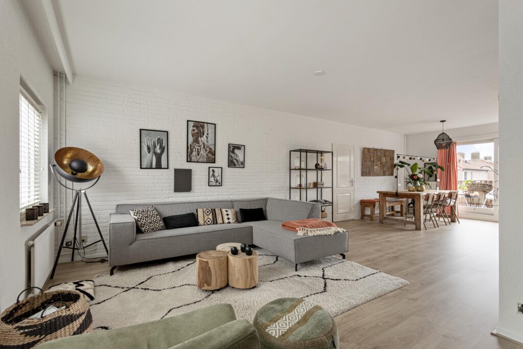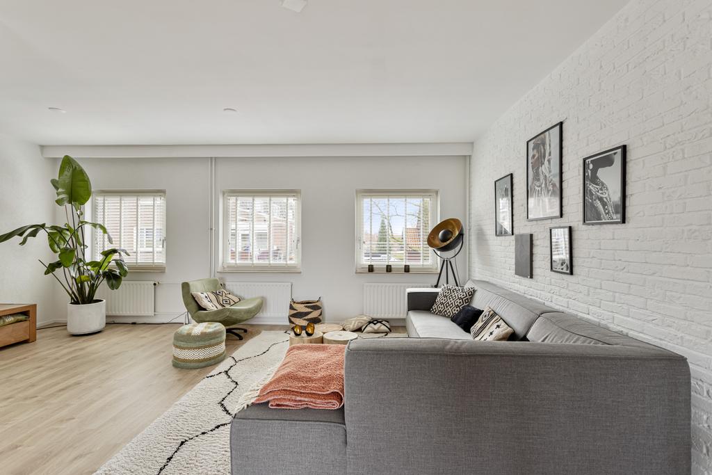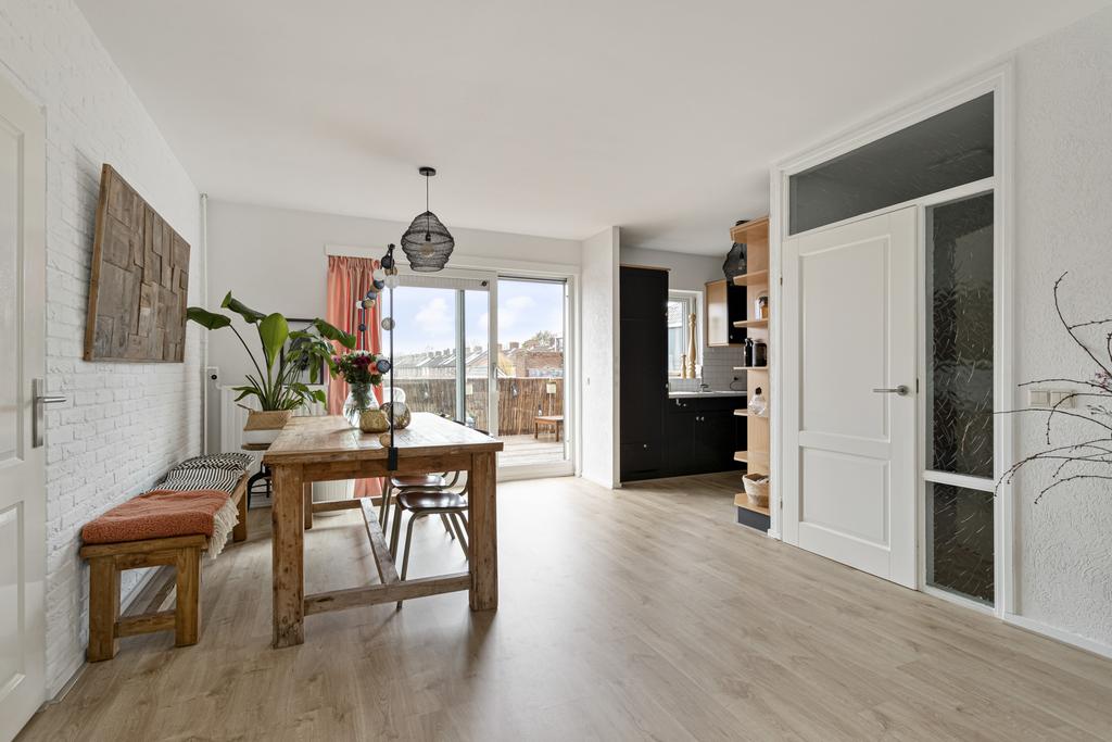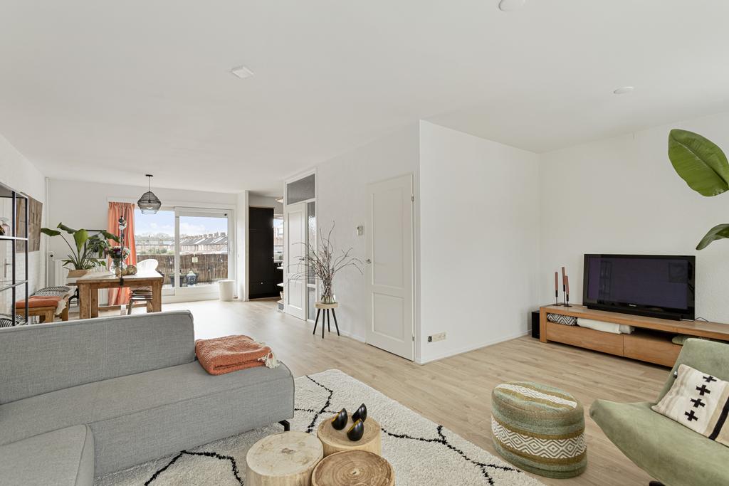 Hal met trapopgang naar de 2e verdieping; grote L-woonkamer (ca. 9.10 x 3.70 m en 2.95 x 2.40 m); open keuken met U-keukenblok voorzien van 5-pits gaskookplaat, afzuigkap, combi-oven, koelkast, vrieskast (ca. 2.55 x 2.40 m); ruim balkon van 18 m² (ca. 6.30 x 2.80 m); tussenhal met toiletruimte en toegang tot slaapkamer I en de badkamer (slaapkamer I aan de voorzijde met dakkapel (ca. 4.10 x 3.25 m); badkamer voorzien van ligbad met douchescherm en -kraan, wastafel en aansluiting wasapparatuur (ca. 2.55 x 2.45 m).