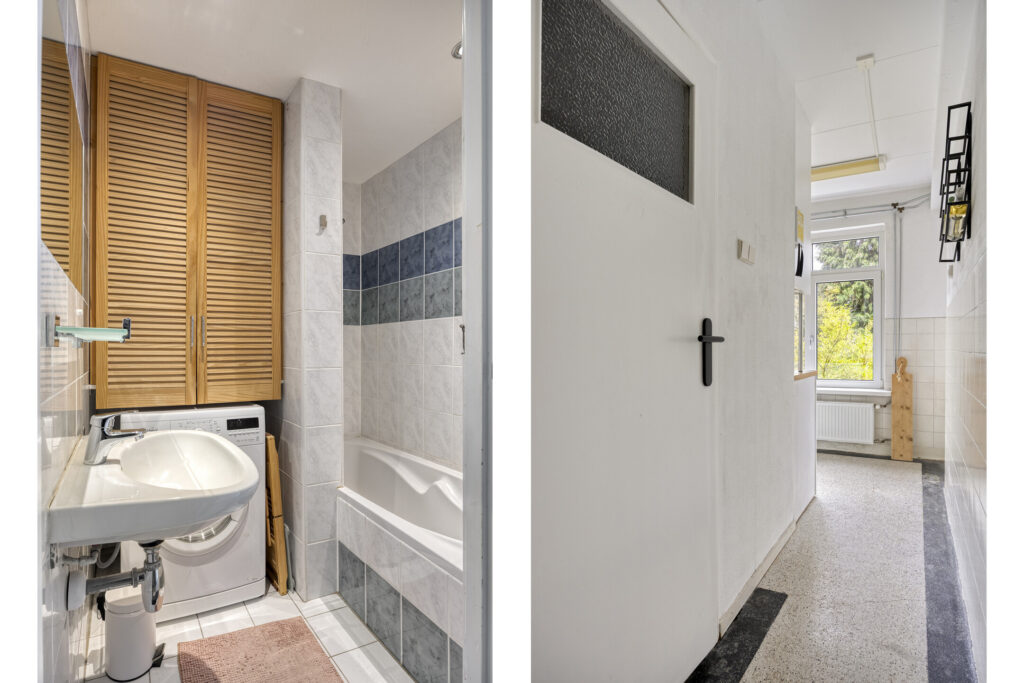 Betegeld en voorzien van een wastafel, bad met douche en kast met aansluiting wasmachine.