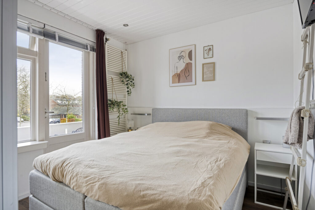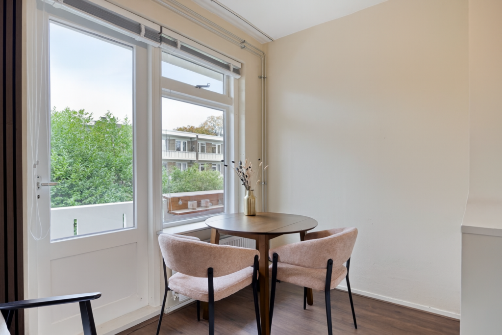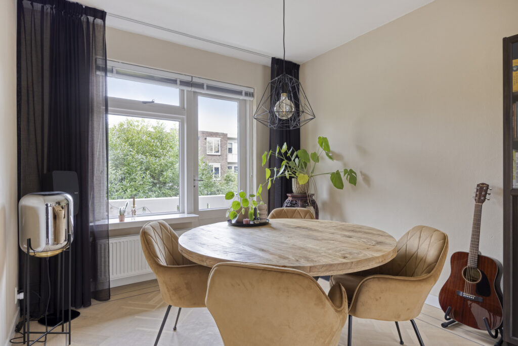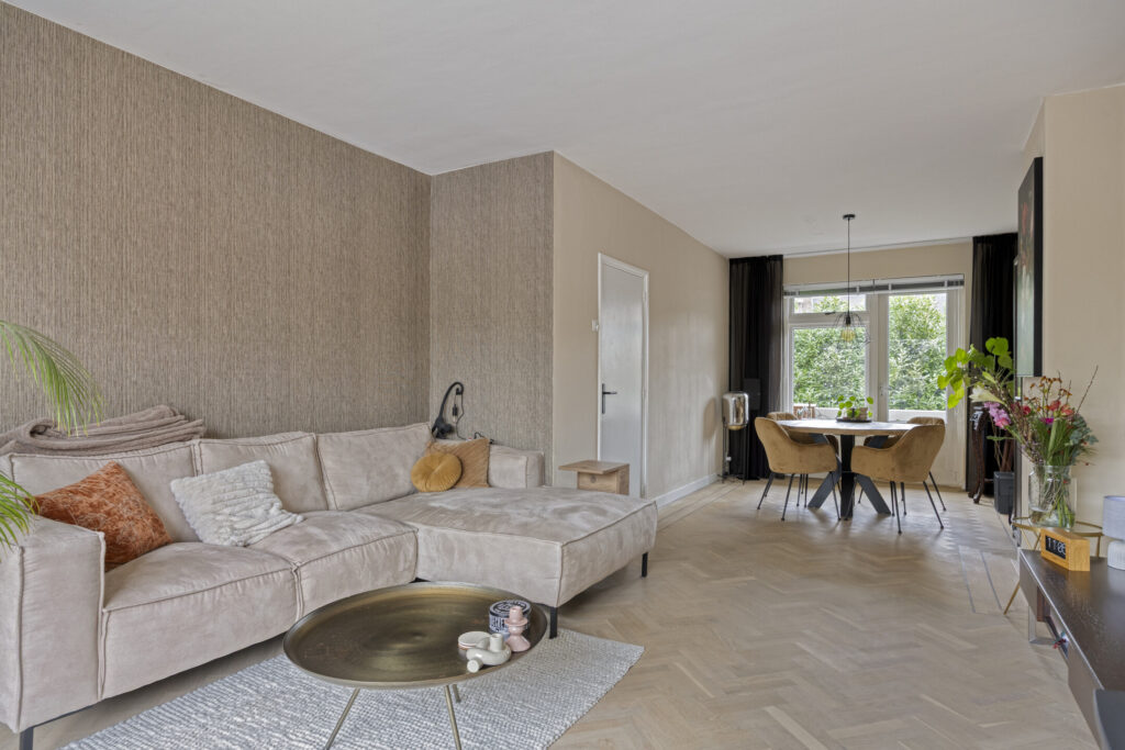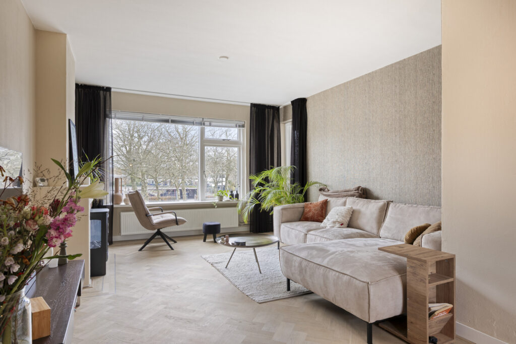 Ruim van formaat, sfeervol met schouw en afgewerkt met klassieke visgraat parketvloer. De woonkamer heeft veel lichtinval door de grote raampartijen en biedt toegang tot balkon 1 en 2.