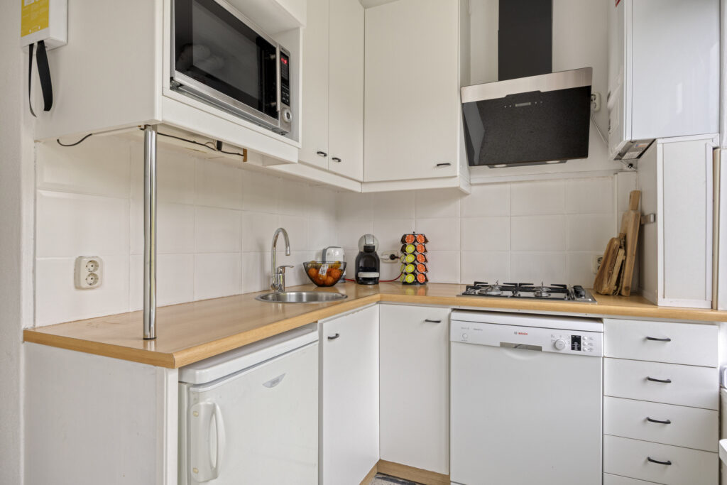 Voorzien van de klassieke granitovloer en voorzien van een keukeninrichting in hoekopstelling met diverse onder- en bovenkasten. Aan inbouwapparatuur is aanwezig een 4 pits gaskookplaat en een afzuigkap. De vaatwasser, oven-magnetron en de koelkast zijn los (blijven achter). Tevens dient de keuken als opstelplaats voor de CV-combiketel (Vaillant 2014) en is er vanuit de keuken toegang tot balkon 1.