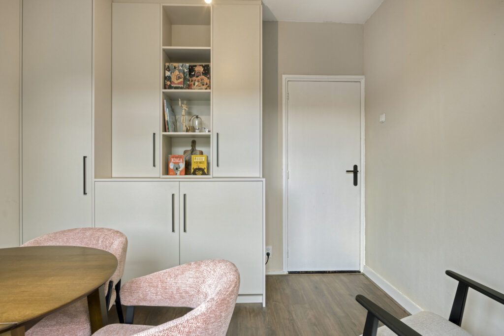 ca. 2.60 x 3.08 m, gelegen aan de achterzijde van het appartement en afgewerkt met een laminaatvloer. Tevens is er een op maat gemaakte kast met extra bergruimte en plaats voor een vriezer en/of droger. Via een loopdeur is er toegang tot balkon 1.